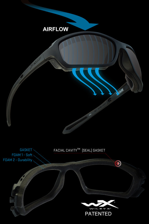 WX WAVEに採用されているFACIAL CAVITY™ガスケット・システムはWILEY X®が特許を持つ画期的なシステムの一つである。フレームからの着脱可能なFACIAL CAVITY™ガスケットは2層ウレタンフォーム構造となっている。一つは柔軟で柔らかいフォームによって顔の形に沿って密着し、もう一つは、そのフォームの劣化を抑制する耐久性に優れたフォームである。また、このFACIAL CAVITY™ガスケット・システムはアイウェアに耐重圧度衝撃が加わった際に衝撃緩和パッドとしても機能する。