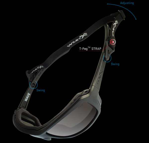 WX WAVEにはT-Peg™ドッキング・システムを実装している。これはテンプルのセンター位置にあるT-Peg™接続口にT-Peg™を接続することでゴーグルと同等の頭部固定を実現し、激しい運動においても確実なフィッティングが得られる。さらにT-Peg™ストラップは接続口を軸にスイングするため、各着用者によって異なる後頭部の形状に合わせてベストフィットする角度で固定することができる。例えば、フレーム着用位置を角度0°とした場合、T-Peg™ストラップは角度10°や角度30°など、無段階の角度に調節することができる。