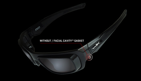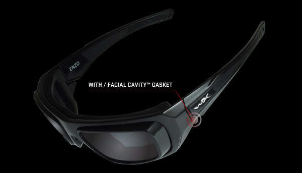 WX ENZO-RIM-に採用されているFACIAL CAVITY™ガスケット・システムはWILEY X®が特許を持つ画期的なシステムの一つである。フレームからの着脱可能なFACIAL CAVITY™ガスケットは2層ウレタンフォーム構造となっている。一つは柔軟で柔らかいフォームによって顔の形に沿って密着し、もう一つは、そのフォームの劣化を抑制する耐久性に優れたフォームである。また、このFACIAL CAVITY™ガスケット・システムはアイウェアに耐重圧度衝撃が加わった際に衝撃緩和パッドとしても機能する。