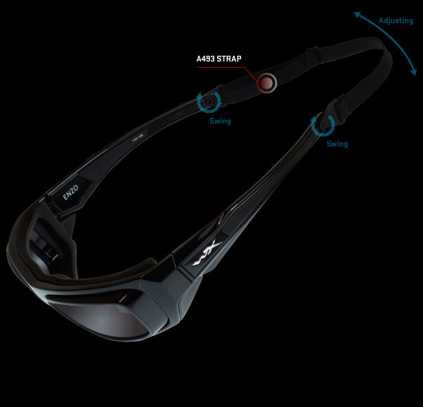 WX ENZO-RIM-にはT-Peg™ドッキング・システムを実装している。これはテンプルの先端にあるT-Peg™接続口にT-Peg™ストラップを接続することでゴーグルと同等の頭部固定を実現し、激しい運動においても確実なフィッティングが得られる。